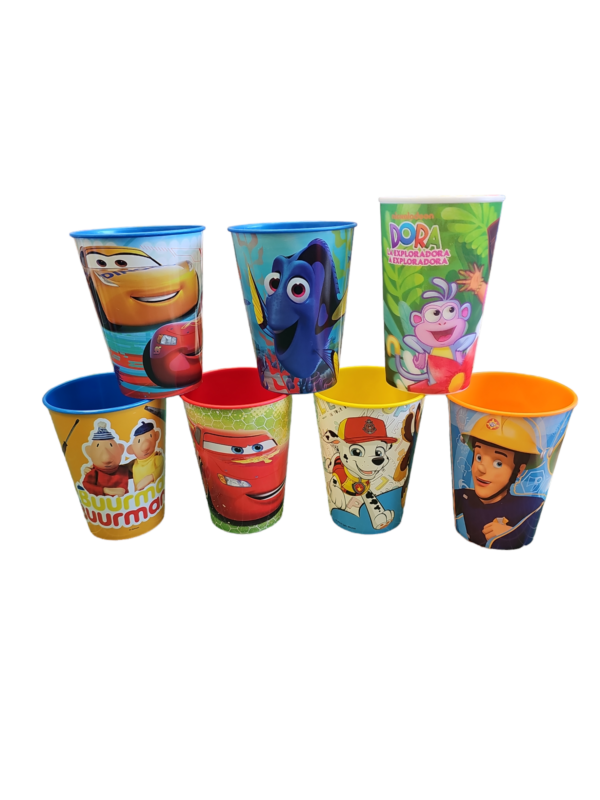 Op de beker staat Frozen, Dora, Cars, Dory, Buurman en Buurman, Paw patrol of Brandweerman Sam.